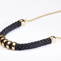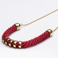 The hand-crocheted necklace is made from red synthetic silk thread and features a grooved arch-shaped metal tube with gold plating.
