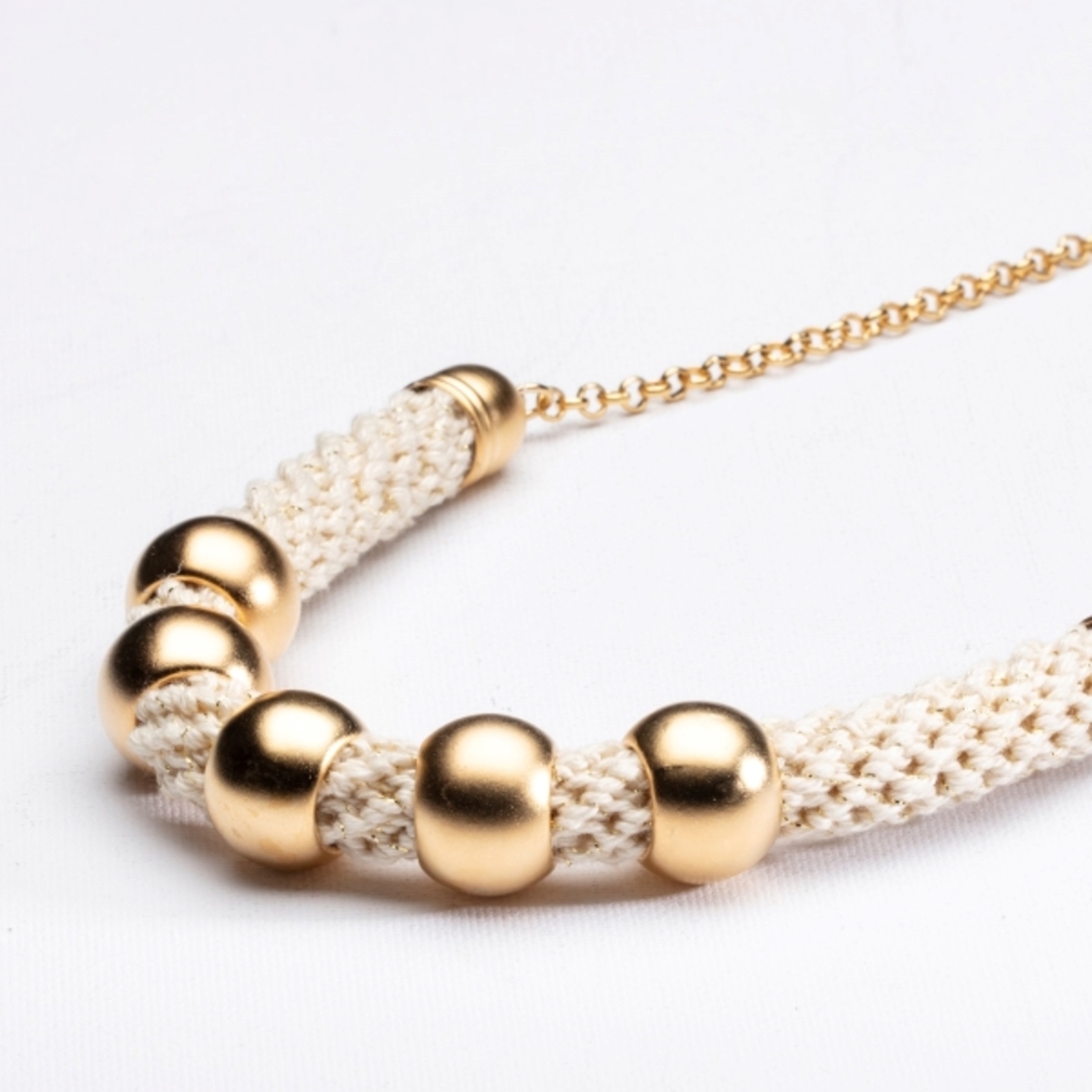 שרשרת סרוגה בעבודת יד מחוט כותנה בצבע שמנת שזור עם חוטי זהב, מלווה בחמש חוליות מצופות זהב.אורך: 50 ס"מ.ניתן להזמין באורך שונה.סיומת: כל חלקי המתכת מצופים זהב.ניתן להזמין את התכשיט גם בצבעים אחרים