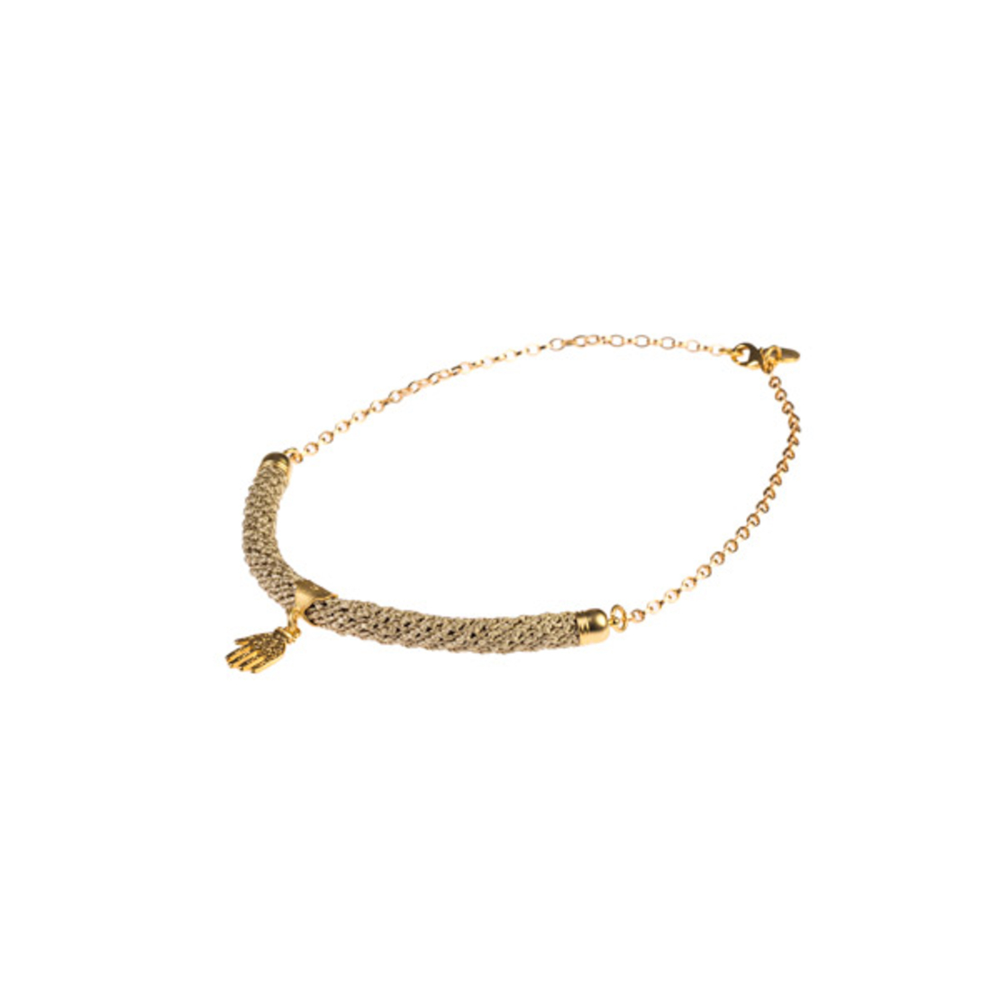 שרשרת סרוגה בעבודת יד מחוט משי סינטטי בצבע זהב, מלווה בתליון בצורת חמסה.